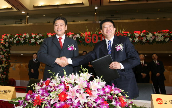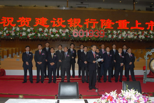 9月25日上午,中国建设银行在上海证券交易所成功挂牌上市。在上证所交易大厅,建设银行董事长郭树清敲响了开市锣声。清脆的开市锣声之后,交易大厅大屏幕上出现了建行8.55元的开盘价,并在盘中一度达到9.05元的最高价,此后,逐步回落,收盘报收于8.53元,比6.45元的发行价高出32.25%。