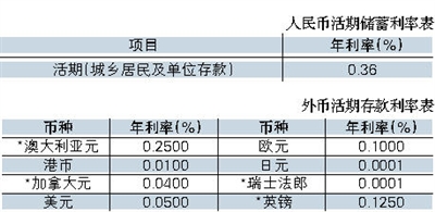 注:自2009-03-21起执行,年利率%。带★为此次调整的币种。 来源:建设银行网站www.ccb.com ●人民币活期储蓄存款 人民币活期储蓄是指开户时不约定存取日期,可随时存取、存取金额不限的一种个人存款。活期存款起存金额为一元,个人活期存款按季结息,按结息日挂牌活期利率计息。不到结息日清户时,按清户日挂牌公告的活期利率计算到清户前一日止。 办理流程:您在办理人民币活期储蓄开户时,填写内容有存款日期、户名、存款金额、身份证种类、号码、联系方式的活期储蓄存款开户申请书和结算凭证,并将开户申请书和现金、身份证件交银行经办人员。银行经办人员审核后,办理开户手续,经您在存款凭条签字确认后,发给您存折,并退还证件;您若要求凭密码或印鉴支取,要在银行网点的密码器上自行按规定格式输入密码,或向经办人员提供两张印鉴卡片。 办理存取款时,实行免填客户凭条,您只需口述存取款需求即可。续存时,将现金和存折(卡)交银行经办人员,支取的,将存折(卡)交银行经办人员,续存200000元(含)以上和支取50000元(不含,下同)以上,需出示身份证件。其他仍按开户相应步骤办理。另外凭密码或印鉴支取存款的,每次都要按规定格式在银行网点的密码器上输入密码或在存款凭条上加盖印鉴。 ●外币活期储蓄存款 外币活期储蓄存款是指不规定存期,客户不需预先通知银行,以各币种外币随时存取款,存取金额不限的一种储蓄业务。币种主要有美元、欧元、港币、日元、英镑、加拿大元、瑞士法郎、澳大利亚元等。外币活期储蓄存款期限为活期。外币活期储蓄功能包括:1、通存通兑:凭密码支取的存折可在建行同城任一网点办理活期通存通兑业务。2、查询服务:建行网点、电话银行、网上银行等各种渠道,为客户提供存折账户的查询服务。3、修改密码:在柜台和银行ATM设备上均可重新设定新密码。4、挂失服务:密码和存折(卡)均可在柜台书面挂失,在电话银行临时挂失。5、自动转存:定期存款到期时,客户不及时处理,由银行按原存款条件继续保留账户。6、打印明细:客户可以在柜台或电话银行申请打印明细或传真明细记录。 外币储蓄存款的客户流程类似于人民币储蓄存款,通常,客户持本人身份证件材料到网点办理开户手续,领取存款凭证,设密码或设印鉴,然后就可通过各种服务渠道享受相关服务。在挂失、修改印鉴等操作环节上需提供身份证件材料。