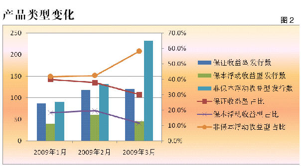 由于银行系统资金充裕,导致票据贴现利率大幅下降而出现利率倒挂,从而限制了票据资产类理财产品的收益水平,因此目前债券和货币市场类理财产品成为了银行理财市场的热点。由于市场环境与政策环境的制约,债券和货币市场投资品以其稳健、灵活的特性,成为近期银行开发理财产品的首选标的。2009年第一季度债券和货币市场类理财产品在发行数和发行占比方面均较之前有所上升,分别升至245款和38.5%。该类理财产品在银行理财市场中仍然占据着重要地位。