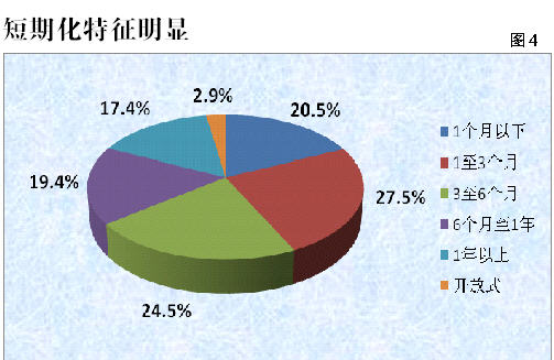 目前债券市场处于调整阶段,商业银行在投资策略上也宜趋短避长,在这类理财产品的投资配置上多采取防御策略,缩短组合久期,减小风险敞口。近期市场不稳定因素仍然较多,并且在短期内资本市场出现向好的迹象。出于随时调整投资方向的需要,投资者对于资金的流动性偏好没有改变。在2009 年已经过去的第一季度里,境内外金融市场的表现仍然让投资者担忧,在经济和金融形势尚未明朗的情形下,投资者对于理财资金的流动性要求仍然较高。本次报告开始将1个月以下期限的超短期理财产品单独统计,因为此类产品在目前已经市场占比足够大。(见图4)