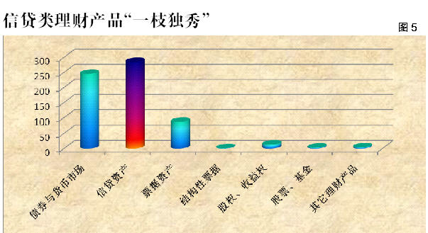 2009年第一季度,银行理财产品资金运用领域的结构比较稳定,市场结构比较单一,信贷类理财产品“独占鳌头”,整个季度的发行数占全部人民币理财产品数的38.5%。(见图5)