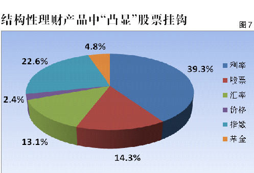 其次,挂钩标的出现新的变化,股票越来越多地出现在挂钩对象中。整体来看,利率、指数与股票成为新的结构性理财产品“三剑客”。值得注意的是,挂钩的指数多为股票指数,而且是相关金融机构自主研发和推出的股票组合指数,相比常见的市场指数,这类指数更有其独特性。虽然资本市场交易品种越来越多地出现于结构性理财产品中,但银行在目前市场形势下,对资本市场标的资产的选择却是更为谨慎,基本在考察整体经济、行业以及政策等各方面因素的基础上选择标的资产。(见图7)
