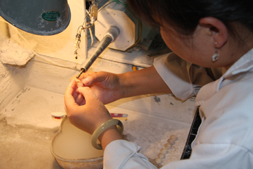 第三是琢玉。设计完成之后,制作者利用磨玉机和工具、磨粉等,按设计意图加工成产品。技巧千变万化,归根到底是琢和磨,琢就是利用铡铊、錾铊等,将造型中的余料研磨掉,其手法有铡、抠、划等。磨就是利用冲铊和磨铊等,将造型中的余料研磨掉,有冲和轧的不同方法。琢玉是属于艺术范畴的创造性劳动,琢玉人员的水平是关键一环。
