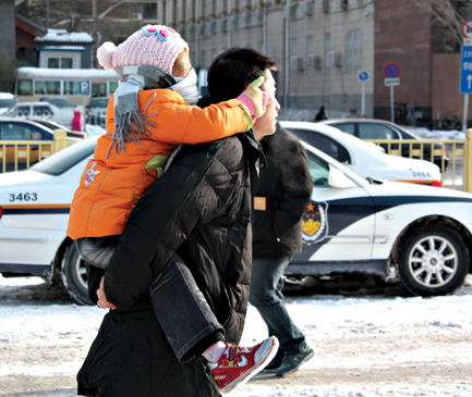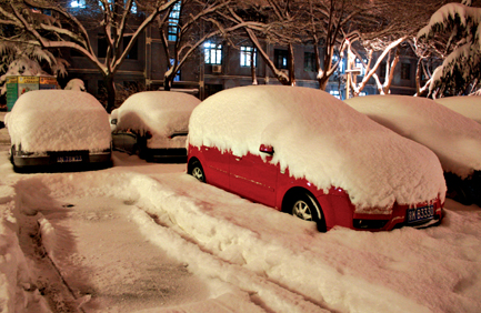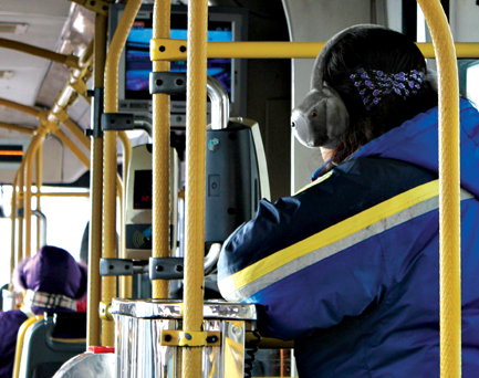 爱美的女售票员戴上了卡通狗耳罩抵挡寒意,女儿在父亲肩上用小手遮住父亲的耳朵为他御寒,汽车被暴雪淹没半个轱辘,车辙留下浓墨重彩的印记……2010年,在暴雪与严寒中,翩然而至。 图/刘静