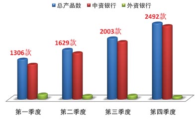 中外资银行在2009年四个季度的发行变化是截然相反。中资银行的发行数逐季增长,从第一季度的1138款到第四季度的2406,变化显著;而外资银行的发行数则逐季下降,从第一季度的159款到第四季度的86款,变化也很显著。剖析这种反差,实际上是因为中资银行加大了信贷类产品的发行,特别是其中的信贷资产类产品。而外资银行则受制于结构性产品的市场需求下降,而减少了此类产品的发行,这严重影响了外资银行的产品推出。
