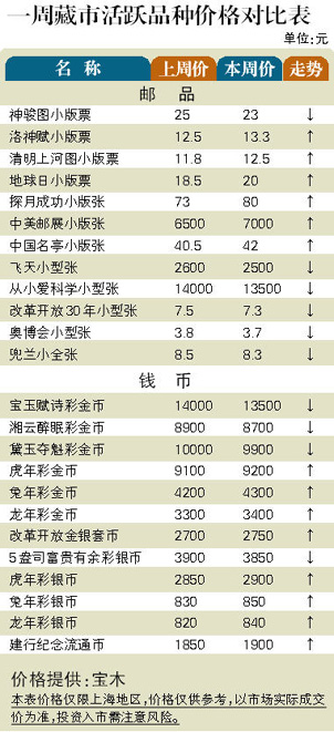 3月中旬,邮币卡市场热点有所减少,但强势品种的上扬格局依旧,回调的主要是近期发行的新邮和彩金币。从表面看近日回调对市场人气有些影响,但市场成交并未明显萎缩,显示市场强势特征在延续。邮市方面:JT邮票升势不减,“庚申猴”邮票已攀高至3800元,而前期滞涨的JT品种也纷纷补涨,其中“牡丹亭”、“敦煌壁画(1)”和“药用植物”小型张分别上扬到140元、100元和85元。鉴于春节后一些JT强势品种大幅攀升,市场需要消化和适应,因此近期强势盘旋在所难免。币市方面:彩金币呈现冲高回落走势,但跌幅有限,如“湘云醉眠”、“夸父追日”和“猴王出世”彩金币仅微挫到8600元、6350元和11800元。新品中的“水浒(1)”彩金银套币回调到4700元附近。