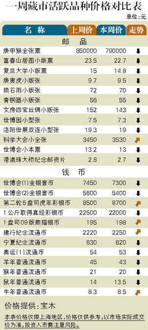 邮市方面:随着“庚申猴”邮票跌破8000元整数关,并下行至7600元附近,JT票板块也呈回调表现,但抛压较有限,惟市场热点变得局促。币市方面:国际黄金价格的高位振荡对币市影响非常有限。彩金银币继续处于盘旋状态,个别品种的下调幅度并不大。纸币经过前期大幅下挫后,近一周来出现了反弹迹象,但动手术品种的价格回升力度却有限,尤其是投资者介入十分谨慎。
