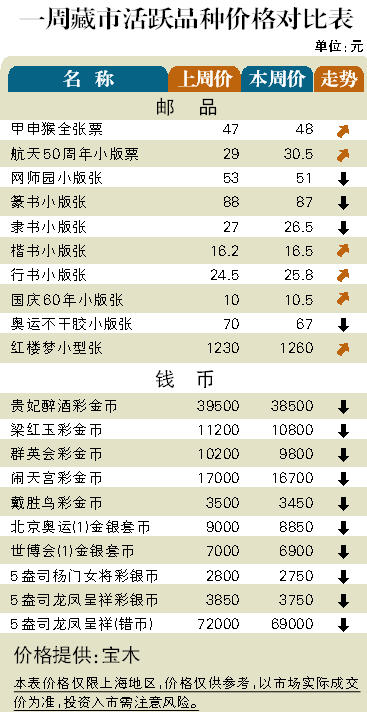 币市方面:彩金银币继续下调,但幅度收敛,不过新发行的“广州亚运(2)”金银套币跌幅不小,近日已滑落至3400元。此外,国际金价居高不下,令“熊猫”金币走势坚挺,2010版1盎司“熊猫”金币在8500元高位盘旋。