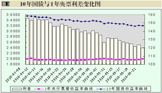 4月中旬房地产调控政策的出台是债市由熊转牛的关键因素,长短利率受此影响大幅下行,央行第三次上调存款准备金率使得短端利率上行明显,债市利率曲线呈现平坦回落趋势,至5月中旬,10年国债与1年央票利差由156bp下降到120bp。(如图3)