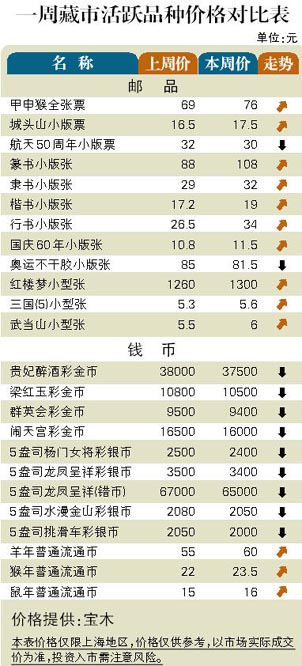 邮市方面:2003年小版张的扬升步法势不可挡,近一周的升幅这次加快,其中“古桥”小版张走高到400元,而“崆峒山”、“毛泽东”、“聊斋(3)”和“百合花”小版张分别攀高至205元、108元、110元和128元。此外,“己丑牛”全张票飙升到62元,一周涨幅高达88%。币市方面:“庚寅虎”5盎司彩银币在12500元整固,“深圳特区”金银套币回落到3850元。而第三版人民币中的“红一角”券扬升到4300元。