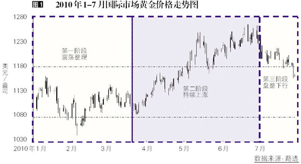 编者按:2010年1-7月国际黄金市场行情总体为上升趋势。1月-3月下旬,金价在1100美元附近盘整;3月下旬-6月末,金价持续上涨;7月份金价震荡下行。世界经济在欧洲债务危机的影响下,复苏放缓但整体预期较为正面;人民币汇改、欧元升值和美元贬值等因素或给金价带来支撑;同时黄金下半年预期需求旺盛。这些因素错综复杂,多空均有,可能影响金价在盘整中继续下行。