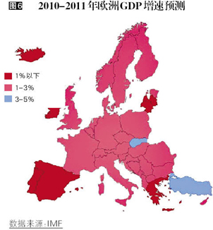 欧洲是主权债务危机的重灾区。欧盟内部一些国家依靠举债来支撑高额的福利支出,债务沉重。在债务危机的影响下,欧洲经济复苏被迫放缓。欧洲国家采取严厉的财政紧缩措施,阻碍了经济增长。欧盟2010年一季度GDP为2.26万亿欧元,当前赤字占GDP的比重为6.3%。今年一季度欧盟经济同比增长0.6%,很大程度上依靠政府消费增长2.7%。欧洲经济前景黯淡(见图 6)。