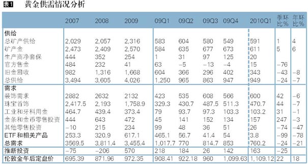 2010年1季度世界黄金供给减少24%,同比从1250吨减少到949吨。旧金回收活动较去年显著下降,官方售金也在生产商解除套保的情况下受到限制。矿产金是唯一同比保持增长的供给来源。黄金需求方面,增长主要集中在首饰和工业领域,同时可确认的投资同比下降69%,因为去年同期特别强劲(见表 1)。