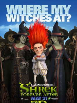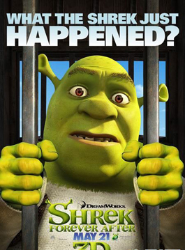 这是官方出品的《怪物史瑞克4》主海报,同预告海报相比。它在画面中继续运用史瑞克极富特点的耳朵作为系列海报的标志,同时各位主角的造型与前几部已大不一样,意味着影片剧情开始有所转折。