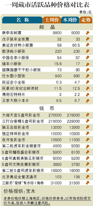 十一长假的市场一反常态,随着买气的出现,前期调整的盘局宣告结束,新一轮上扬开始。邮市方面:小版张再度成为热点,2003年小版张重新领涨,其中“清真寺”和“青铜器”小版张分别扬升到62元和80元,涨幅超过2成。50元面值金箔小型张继续增强,市价涨至65元,“九龙壁”小型张整盒价突破1000元整数关。老邮中,“辛酉鸡”全张票创出22000元新高。币市方面:热点不断,“京剧脸谱(1)”彩银币全套走高到5500元,“云冈石窟”1公斤银币上攀至36000元。第四版人民币继续调整,市场买气十分谨慎,而第三版人民币有买盘光顾,资金似存转移迹象。