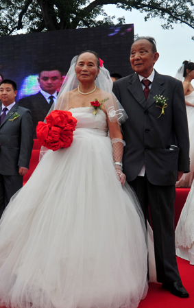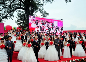 四川省什邡师古镇红豆村在中秋节举办了“缘定四川,情满天下——灾后重建青年集体婚礼”庆典活动, 99对新人在1200多岁的红豆树下,手挽人走上红地毯。最年长的88岁,年轻的21岁。著名演员谢芳女士和优秀歌剧演员张目先先生前来为新人祝福证婚,宣读爱情誓言,婚礼在《相亲相爱一家人》的齐唱中推向高潮,幸福的热泪洒在了红豆树下。 王福明/图文