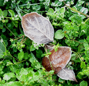 哈尔滨,10.23,5点 一些植被的叶子上已经结了霜花