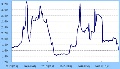 货币市场:虽然通胀预期升温,债市恐慌情绪致收益率全面上涨,但市场资金面充裕,货币市场利率下降明显,7天回购利率较前周下降40bp,收于1.6143%
