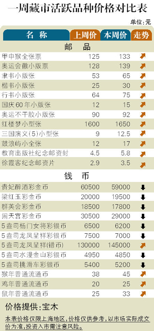 11月下旬,藏市人气进一步升华,成交炙热,低价品种补涨趋势明显。相对而言,币市继续回调,但强势品种抗跌性不错。邮市:编年小型张加速回升,“武当山”、“步辇图”和“百合花”小型张整盒价攀升到1180元、3500元和2300元,一周涨幅接近40%。小版张强势延续,“篆书”、“民运会”和“昆曲”分别扬升到280元、120元和36元。生肖版张回调,“戊辰龙”和“乙酉鸡”全张票分别下沉到2300元和60元。币市:金银币在前期回调之后,出现振荡盘旋之态,成交明显萎缩。但流通纪念币上扬,其中“羊年”、“建行”、“宁夏”和“宋庆龄”分别上扬到105元、3300元、810元和47元。