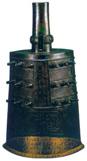 西周晚期·宗周钟 高:65.6厘米;舞纵:23.1厘米,横:30厘米; 两于相距:26.2厘米;两铣相距:35.2厘米;重:34.900公斤 钟是古代典礼时使用的打击乐器之一,宗周钟是西周厉王的用器。钟的两面各有18个突出的乳丁,钟的开口朝下,只有悬挂起来,才能敲击演奏。宗周钟的珍贵,在于钟身上刻有长达123字的铭文。铭文的大意是:周厉王时,南方濮国入侵,周厉王亲自讨伐,凯旋之后,铸造此钟,用来感谢敬拜祖先。铭文中有“仓仓匆匆”的象声词,形容钟敲起来的声音。宗周钟这件青铜器不仅给我们留下了珍贵的史料和视觉的享受,也是研究古乐不可缺少的佐证。