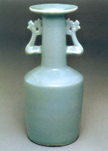 盘口,直颈、直腹形成二阶式的瓶身,在直颈的双侧加上双凤或双龙耳,这种造型始于宋朝。颈与腹成二阶段平直线,呈现的最为平实无奇的线条,但也是最扎实稳定的组合。这种造型由宋一直到 明初都有烧造,以宋时在造型和釉色上最为精美。