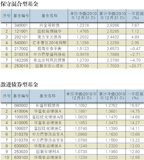 在所有保守型混合基金中,本月涨幅第一被兴全可转债夺得,该基金全月净值上涨1.33%;国联安安心成长则成为了本月垫底,净值下跌了8.25%。12月份的排行与全年排行大同小异,兴全可转债以7.67%的涨幅夺得本年度的涨幅头名;长期以来经常出现在涨幅榜垫底位置的国联安安心成长则毫无悬念的成为2010年最不具投资价值的保守型基金,其年度跌幅达20.77%。