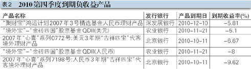 在未实现预期收益的20款产品中,其中有5款产品到期收益为负,且投资对象均为基金。其中,亏损幅度最大的产品为北京银行——“2007年‘心喜’系列7198号:人民币3年期吉祥四宝代客境外理财产品”。该产品成立于2007年10月,期限为3年。产品资金主要投资于美林集团发行的以美元计价的3年期票据 -- 美林全球精英基金组合票据(“境外票据”),且在80%的情况下,尽可能扩大对全球精英基金组合的投资比例,而全球精英基金组合由摩根士丹利亚洲房地产基金、怡富中国基金、邓普顿环球均衡增长基金与贝莱德美林世界矿业基金四只基金组成,组合比例均为25%。然而,四只基金在金融危机的2008年严重受累,最终以-9.62 %收官。(表2)