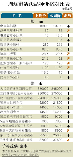 春节临近,市场出摊率逐日减少,不少邮商纷纷踏上回家之途。受此影响,邮币市场成交量下降,热点也渐渐下降。邮市:尽管热点新邮价格在上周末出现上扬,但市场的成交却没有明显放大。到本周初,“行书”和“资本市场”小型张分别扬升到102元和80元,“辛卯兔”全张票和小版张上涨到76元和35.5元。币市:金银币价格变化不大,市场热点逍遁,尤其是随着国际黄金价格的下挫,投资者变得非常谨慎。生肖贺岁中,受到礼品需求刺激,生肖流通币中的“虎年”成交活跃,但因货源充裕,价格下滑到10.5元附近。