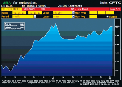 2010年,COMEX黄金期货较有代表性的商业性多头持仓变动也呈现出与金价明显相关的趋势。多头持仓在七月份之前飙升至约20万手合约,之后便一致处于逐渐下降的状态。到目前为止,商业性的多头持仓仍少于空头持仓,可见实货交易者仍然看空黄金,最新空头持仓约为40万手,是多头持仓的两倍。(图8、9)
