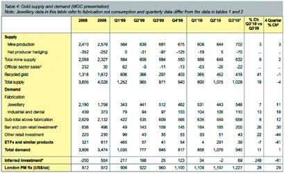 根据世界黄金协会的数据,截至2010年3季度,世界黄金总供给为1028吨,同比增加18%;总需求为940吨,同比增加11%,供给稍多于需求。虽然金价在2010年不断攀升,但是金矿产量短期难以增加,这两个因素使供需基本平衡。