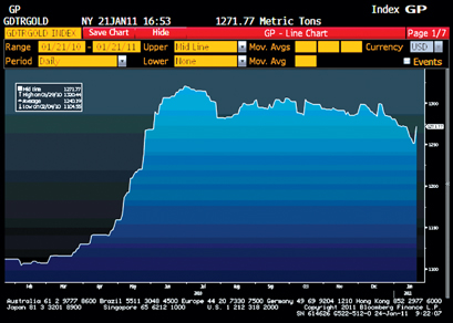 2010年,SPDR Gold Trust持仓量随着金价波动也有所下降。随着金价飙升,其持仓量在