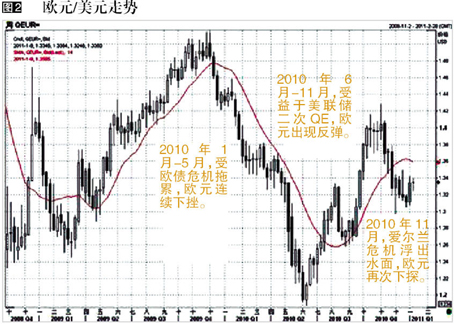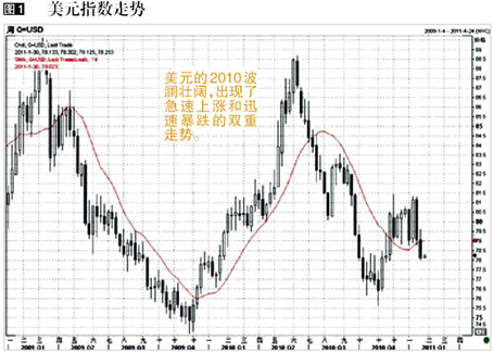 2010年美元在欧债危机和量化宽松两大因素的影响下,经历了先升后跌的过程,总体上呈现上涨态势。(图1)
