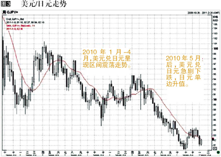 2010年,日元对美元与欧元的累计涨幅分别约为13%和24%。1月至4月,美元对日元在88至94之间宽幅震荡,6月份后美元对日元出现单边下行走势,汇价在
