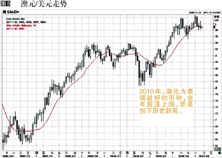澳元为2010年表现最为亮丽的货币之一,受益于中国经济的高速发展,澳大利亚经济表现强劲,随着澳元升息和国际大宗商品价格的节节攀升,澳元对美元也创下了自其可自由兑换以来的历史新高1.0257。(图5)