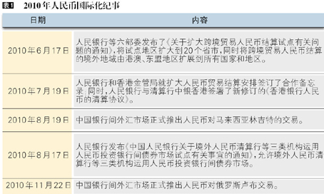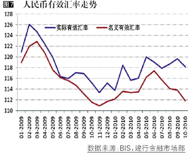 2010年,跨境贸易人民币结算发展迅猛,人民币国际化步伐加快。人民币作为商品交易的计价货币进入国际市场,并被市场参与者广泛接受,客观上要求人民币保持相对强势,真正体现货币的财富储存职能;另外,人民币国际化势必增加资金流入压力。因此,人民币国际化也是人民币汇率走势的一个重要影响因素。