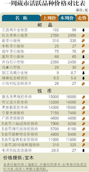 上周藏市表现跌宕,但热点仍延续前一周格局,体现在老邮热点进一步放大,新邮则冲高回调,而彩金银币回升力度有所增加。邮市:“庚申猴”再创新高,价格扬升到12000元附近,小型张中的“兵马俑”、“西厢记”和“孙中山”分别为430元、980元、60元,而近期发行的“清明节”、“楷书”、“昆曲”和“石湾陶瓷”小版张分别下滑到16.5元、41元、38元和20元。币市:彩金银币继续回升,其中“贵妃醉酒”彩金币创出6600元新高,“黛玉夺魁”和“猴王出世”1/2盎司彩金币攀升到34000元和24000元,“红一角”券突破5000元整数关。