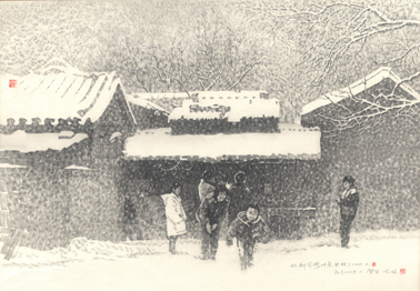 前边孩子和大人嬉笑的场景,是家人在老家的照片。我将全景“复制”到了画里,是希望一家子人都能在北京看到雪景,里面有我儿子,我小姨子、还有她的孩子。这个胡同我每次路过都会取材,如果发现有好的素材,马上就会拍下来。现在有数码相机就更方便了。我从93年开始,一直到09年都有这个胡同的资料。但是很难再取到孩子玩耍的照片,现在哪有小孩还会这么开心的玩,所以我也希望孩子能够轻松、自由。这幅画前后我用了5年的时间,前两幅我觉得感觉不对都丢掉了,春天、秋天、还有冬天非雪景的时候都画过,但感觉都不对,就是胡同的氛围没有处理好。一幅好的作品既要能体现画家的表现力,又要反映出所画物体的自然状态,这种结合很难,像这幅画雪景的感觉就对了。其实正面中间房子被雪覆盖的地方是“可口可乐”的广告牌,如果没有下雪,主体建筑很容易被环境湮没,但现在换成雪景一下就突出出来了。同一个东西,不同的时候去表现会有不同的效果。而且这个所谓的“感觉”,只有画出来才知道对不对,光凭想象是想象不出来的。