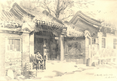 这幅画取材于较早的素材,但是也没有完全按照素材画。原来右侧墙壁停靠了很多车,房檐上的杂草也没这么多,只是为了不让画面显得空旷,所以草就耷拉得比较多。这张画的主题是老门楼和树上的秋叶,我感觉很温馨。那个正在闲坐的人当时正在看我取材,那时的人还是生活得很悠闲自得,有时间和心情坐在家门口什么也不干,就看看街景。我觉得那就是老北京人的生活,是老北京的生活节奏,完全没有时间的紧迫感。但画上的那个人原来坐在门楼的右侧,从构图上挡住了视线,所以把他挪到了左侧。这些改动都是在创作的时候再做调整的。把车去掉是因为与整体环境不和谐。因为这幅画如果再加上车,不论是车的完整性还是墙壁的完整性都会破坏掉,现在看上去一个简单的老门楼挺好。这幅画虽是十几天画成的,但是也花了很长时间才达成理想效果,我画画之前会先再去看一遍实地情况,通常一个地方的素材会有几个时期的,经过筛选后再选出最能表达出我感觉的且适合意境的素材。