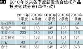 2011年第1季度,集合信托产品发行量同比显著增长,环比下降:共有53家信托公司向市场输送538款集合信托产品,较2010年第1季度378款的发行量增长42.33%,而2010年第4季度661款的发行量减少18.61%。其中,中融信托与外贸信托交替担任着季度发行量第一的角色,上季度发行量第二的中融信托本季度以64款跃升为发行量第一的宝座,而上季度发行量第一的外贸信托以56款的发行量退居第二。另外,发行量达到或超过20款的还有平安信托、联华信托、西安信托、中铁信托、华宝信托,分别为32款、24款、21款、21款、20款。(图1