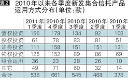 从运用方式看,本季度债权投资、股权投资、证券投资、物权投资与组合运用分别发行156款、61款、111款、125款、36款,占比分别为29.00%11.34%20.63%23.23%6.69%。其中,除组合运用类外,其它类型产品的发行量均有所下降。组合运用类产品一定程度上可以分散风险,其可以是资金在债权、股权、物权运用方式上的组合使用,例如中融信托旗下的景程11” 以股权、购买特定资产权益、贷款、可转股债权、投资经营性资产等方式投资于优质企业及项目;也可以是某一领域多个项目的组合投资,例如吉林信托旗下的松花江19’信托计划的资金就分散向郴州市等五家企业发放信托贷款。(表2