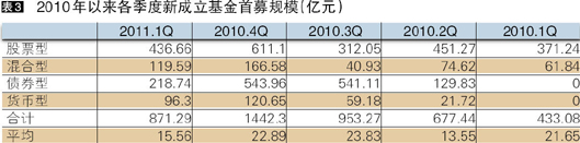 从成立基金的类型上看,本季度共有31只股票型(包括指数基金、QDII基金;分级基金分开计算)、4只混合型(含保本型基金)、15只债券型与6只货币市场型成立。在市场避险情绪加剧的背景下,低风险型产品需求依旧旺盛:2011年债券型发行数量继续延续2010年的高位,而根据以往历史表现可见,债券型基金年收益一般在5.00%左右,收益一般可以预期;同时,4只混合型基金中,共有3只保本型基金。此外,指数型基金再度受捧,从产品的投资风格来看,20111季度共有17只指数型基金,占新成立产品的30.36%
