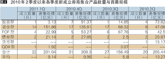受到2011年初股市行情低迷以及春节的影响,2011年第一季度产品发行数量出现大幅回落,产品成立数量仅为22只,较2011年四季度减少9只,下降幅度达到29.03%。混合型产品逐渐成为主流产品,本季度成立数量为14只,发行数量比四季度减少3只,但是市场占比上升至63.64%;其次,FOF型产品发行数为4款,较上季度减少1款,市场占比为18.18%;此外,股票型、债券型和QDII型产品成立数分别为1款、2款和1款。(表4