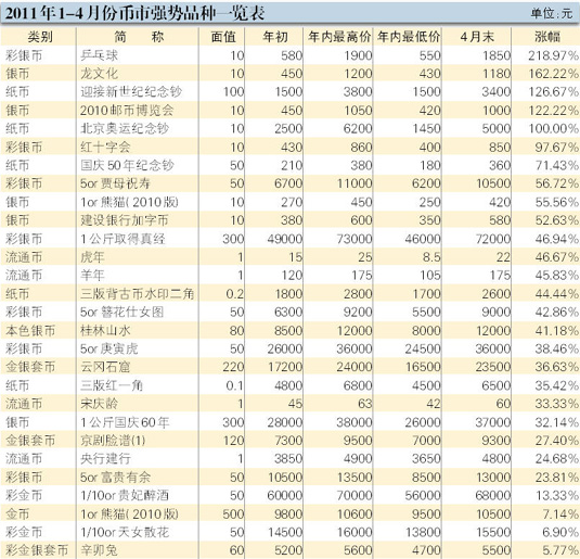 在2011年前4个月的藏市上,币市可谓一枝独秀,形成了纸币、流通币和金银币交替上扬并引领市场热点的现象,令大量投资者刮目相看,并由此占据了邮币卡市场交易量的半壁江山。这种热门板块互动、热点此起彼伏、成交日趋活跃的局面,无疑反映出币市炙热的现状,也是整个币市从前两年的纸币独当一面,到去年的金银币后来居上,再步入热点板块全面开花的大行情演绎,充分显示出钱币市场牛市格局已扑面而来。