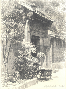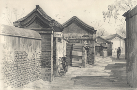 画这条胡同很重要的原因之一是因为它的门檐非常漂亮,和我同期画的其他几张都不同,这是唯一一幅突显了门檐纹饰的门楼,门檐上有非常精美的雕花,像这种就是设计得比较复杂的了,原来主人的身份也要高一些。虽然画里的场景非常平民化,有三轮车,门口还有个报箱(被植被挡住)。但是你可以想象当时的主人,他应该是有一定的身份和品味,平且也有些财力,才会把这座看似不起眼的门楼修得如此精美和刻意。它和下一幅(前百户胡同)承载的是不同的记忆。刚才提到前百户,我用了“土”字来形容,那这个门楼在画里还能让人感觉到的就是“贵”气,而且这种气场很强大。