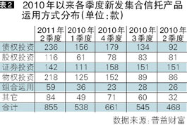 从运用方式看,本季度股权类增幅较大,达47.41%,这主要是因为房地产信托产品多数以股权方式发售。房地产股权信托多是信托公司将信托资金投资房地产公司旗下项目公司的股权,为房地产项目的开发提供资金,并安排项目公司股东等关联方或者第三方在信托产品到期时进时回购,并辅以地产抵押等措施控制产品的风险,这类产品实质是融资。不过,这类产品的收益率也远远高于其它运用方式的信托产品,2年期产品的年化收益率达13%、14%已不少见,有的甚至达到15%。(表2)