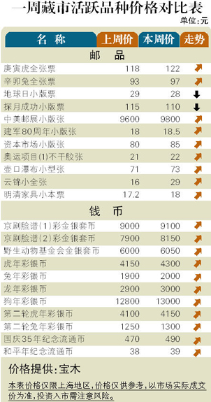 8月上旬藏市继续振荡,热点品种价格波动频繁,但振幅收敛,振仓迹象明显。邮市:第三轮生肖版张继续上蹿下跳,不过波动幅度局限于15%,而市场上的货源再度趋紧。双连小型张振幅仅10%,其中价格偏低的“邮联六大”一周涨幅10%。第一轮生肖中的“龙年”版张创出3300元新高,单枚邮票也扬升至17元,一个月升幅接近翻番。币市:金银币总体表现平稳,不少品种在7月末上台阶后即再度盘旋,显示出成交量没有放大的影响。当然市场依然存在个品热点,如“辛卯兔”5盎司彩银币价格就攀升到19000元附近,第三版人民币“背绿”有水印1角面值券价格上涨至48000元。