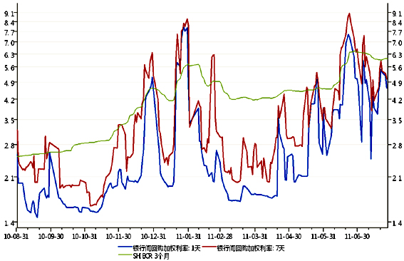 今年债市走熊的一个突出原因在于银行间资金面的持续紧张,其中原因我们在前文的回顾中已经详细分析过,所以在经济形势相对明朗、物价涨势明确回落的预期下,资金面是否能重回宽裕的局面将是债市阶段性走暖的催化剂。从目前的情况看,我们在三季度都很难看到这一局面。
