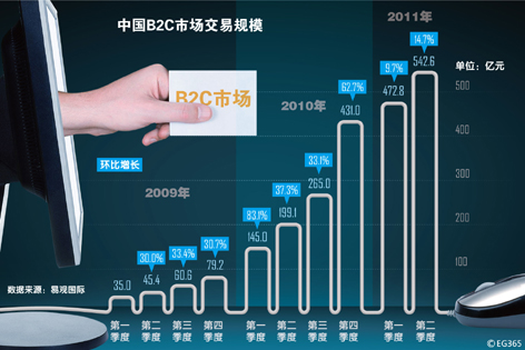 根据易观国际发布的《2011年第2季度中国网上零售市场季度监测》数据显示,2011年第2季度中国B2C市场交易规模达到542.6亿元,环比增长14.7%,同比增长172.6%。图片作者:EG365/CFP