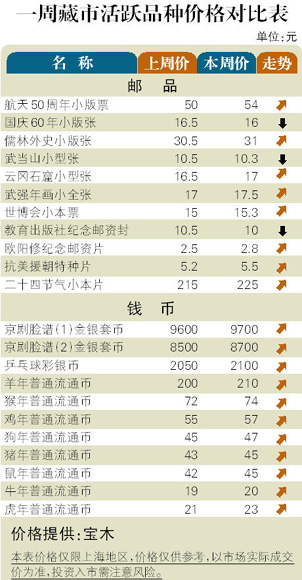 9月藏市场热点继续增加,市场人气活跃,刷新历史新高品种有增无减。邮市:编号邮票呈现量增价升的全线飘红之态,不少品种一周升幅在15%,本周初“王进喜”、“体育运动”和“延安文艺讲话”套票分别创出500元、1450元和1550元新高,整部全品编号邮票价格上攀至32500元。近期热点新邮有所回调,如“甲申猴”全张票下滑到6380元附近。币市:金银价格波动仍频繁,而金银币价格相对稳定,惟新品种回调。“春节”1/3金币上涨到4900元,“登封─天地之中”金银套币下挫至7200元,“清华大学”金银套币下挫到10500元附近,2011版1盎司“熊猫”银币回升到325元。