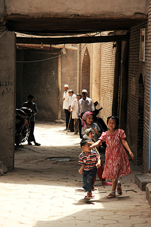 越往高台民居的深处走,更多是过着平常日子的维族人家。家门多是紧闭。艾力告诉我,如果门是敞着的,则表示主人欢迎客人的到访,若是半开,则需要敲门得到许可后方能进入,如果大门紧闭,则代表主人不在家,或者现在不便见客。在一处紧闭的铁门前,艾力指着一对粗细不同的门环问我们,见惯对称设计的我们面面相觑。艾力说,这对不同的门环显示出维族人对于宗教禁忌的严格恪守:客人会依照性别叩响不同粗细的门环,这样独自在家的女主人则能通过叩门声辨别来客是男是女,如果是男性,则女主人便不会开门。“现在也需要这样做吗?”艾力点点头。我们随着艾力拐入另一条更深的巷子,孩子在纵横交错的巷口间打闹着,捉迷藏。或者在一块平地上玩着飞行棋,我问那四个玩得正酣的孩子棋是谁的,他们头也不抬,用不流利的普通话告诉我是游客送给他们的。正是晌午时分,更小的孩子多依偎在母亲的怀里睡觉。看到有生人路过,便会怯生生地偷偷打量。路边的高台上,偶尔坐着两三个闲聊的维族妇女,身裹长袍,头掩纱巾,唯一露出的脸部,眉间相连。据说每个维吾尔族母亲生下女儿后,都会用一种叫做“乌斯曼”的草挤压出草汁,每天涂在女儿的眉毛上,让女儿双眉间的距离越来越短,眉毛又黑又长。眉毛越近,则预示女儿会嫁得越近,眉毛越远,嫁得越远,若是连眉,则嫁邻居。由于交通不便,古时的维族人不愿意将自己的女儿嫁到远方,免遭离别之苦。老城里的女性,基本都是连眉。这些弯曲的小巷被游客称为“时间停止的地方”,城外的翻覆和多元化,丝毫没有影响到这座中世纪的古城。